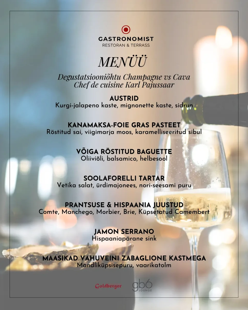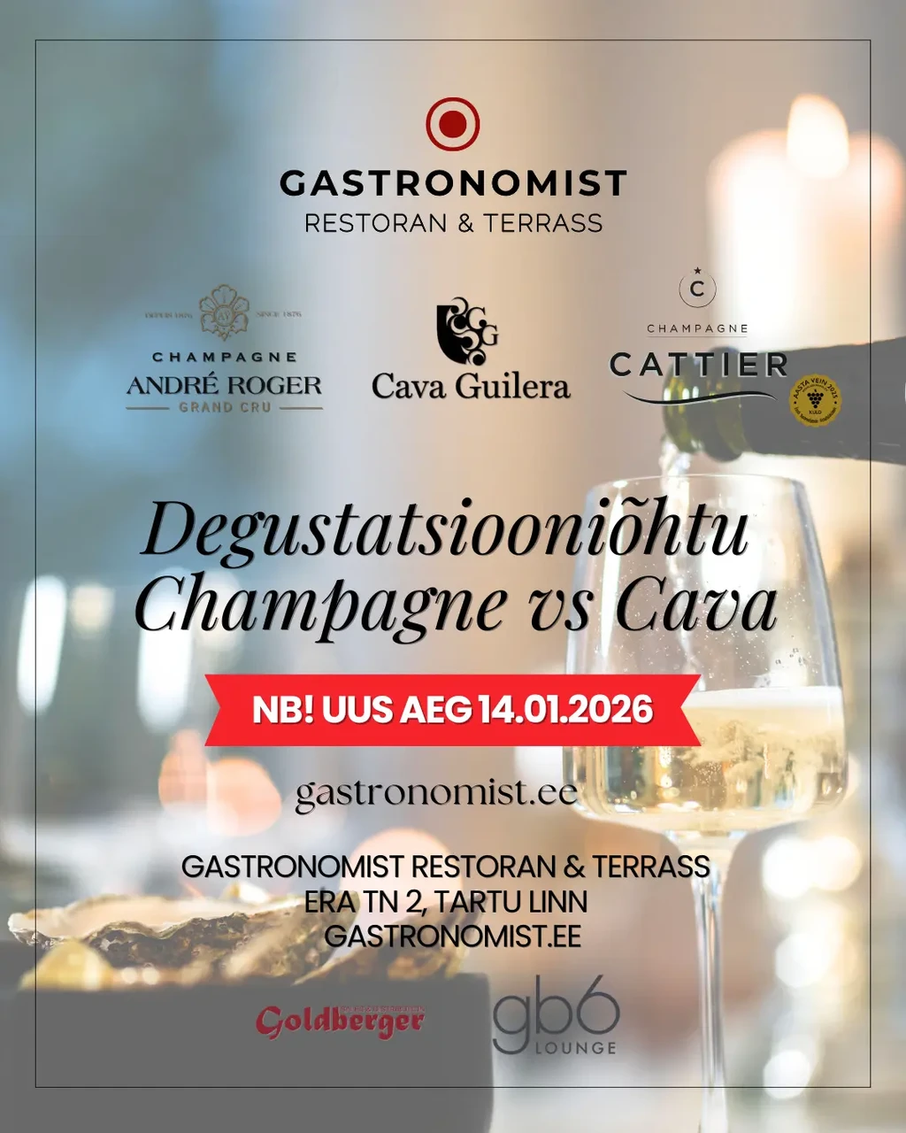 NB! EDASI LÜKATUD! UUS KUUPÄEV 14.01Seoses sommeljee haigestumisega oleme sunnitud ürituse edasi lükkama. Shampanjad valatakse välja nüüd 14.01 kuupäeval.