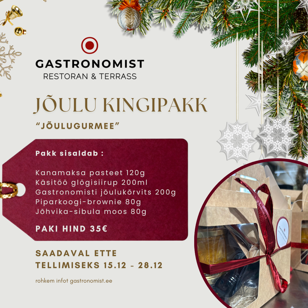 Soovitame kinkekomplekti täiendada Gastronomisti kinkekaardiga, mis on saadaval väärtustes 50 €, 75 € ja 100 € – ideaalne lisa jõulumaitsete kõrvale.
