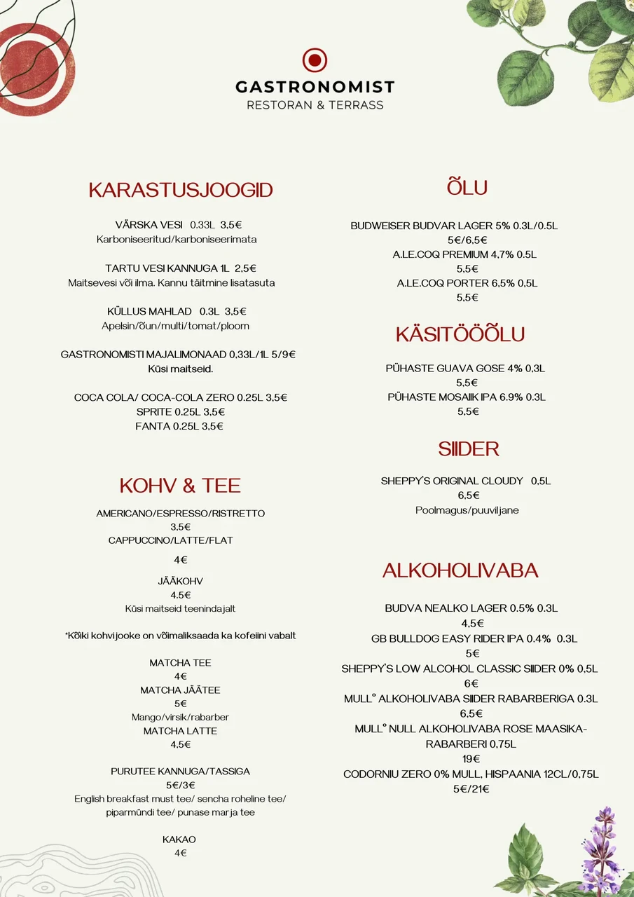 Kuigi me teeme endast parima, et menüüsid vastavalt muutustele uuendada, aga sellegipoolest võib juhtuda, et mõni menüü võib olla aegunud infoga. Kui mõni toode tekitab huvi või küsimusi siis julgelt meile kirjutada või helistada!