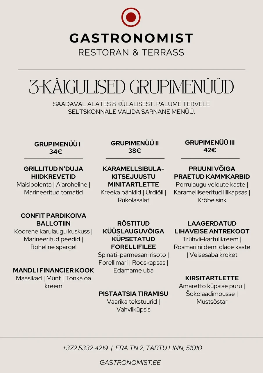 Saadaval alates 8 külalisest. Palume tervele seltskonnale valida sarnane menüü